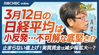 春闘満額回答相次ぐ、日銀利上げは?│NQN古門成年氏【3月12日(水)東京株式市場】日経平均株価は小反発、不可解な底堅さ/米国株テラダイン急落、日本株アドテストも/止まらぬ値上げ、実質賃金は減少幅拡大