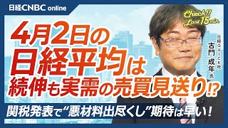 相互関税発表で悪材料出尽くしにはならない!自動車株や海運株注目│NQN 古門成年氏【4月2日(水)東京株式市場】日経平均株価は続伸、米国株も日本株も方向感なし/ファストリ急伸先物主導/百貨店株安値続出