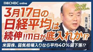 米国株・弱気相場入りなら4割下落も│張間正義氏【3月17日(月)東京株式市場】日経平均株価は続伸、底入れ感?/防衛株や銀行株高、三菱重急伸、三菱グループ⇧/日銀利上げは7月か/日本株・PER低下が重荷