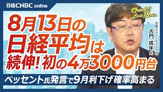 【8月13日(水)東京株式市場】日経平均株価は続伸/初の4万3000円台/海外勢の猛烈な買いが続く/業績さえない企業も高値/減益でも高値更新している銘柄には注意が必要/ベッセント氏発言で9月利下げか