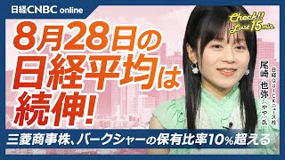 【8月28日(木)東京株式市場】日経平均株価は続伸/エヌビディア5-7月期売上高56%増も「H20」は販売ゼロ/バークシャー、三菱商事の保有比率10%超える/SOMPOは米アスペンを5000億で買収