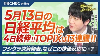 フジクラ決算後の決算プレイ、急落の理由は│NQN鈴木孝太朗氏【5月13日(火)東京株式市場】日経平均株価は4日続伸、TOPIXは13連騰/米中対立緩和、日本株も中国関連や半導体株⇧/円安で自動車株が⇧