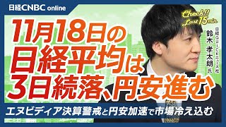 エヌビディア決算に警戒感【11月18日(火)東京株式市場】日経平均は3日続落/円安が加速し史上初のユーロ円180円台に/ビットコインも急落メタプラ11%安/ 免税店や百貨店など中国依存が高い企業に重荷