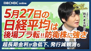 超長期金利の急低下、発行減観測も│NQN鈴木孝太朗氏【5月27日(火)東京株式市場】日経平均株価は3日続伸、円安、後場プラス圏に/株主総会・セブン&アイは/川重大商い、防衛株に強さ/ジーエヌアイ高騰