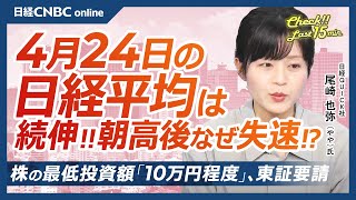 株の最低投資額10万円へ東証要請│NQN尾崎也弥氏【4月24日(木)東京株式市場】日経平均株価は続伸、米国株高と円安進行/日本株・円高一服で自動車株や半導体株⇧/対中関税は/ファナック、業績未定も上昇
