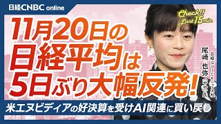 日経平均は大幅反発で一時5万円乗せる場面も【11月20日(木)東京株式市場】エヌビディア好決算でAI関連急騰/日中関係悪化でサンリオ株の影響は/利下げ見送りと財政懸念で円安加速/注目銘柄:寿スピリッツ