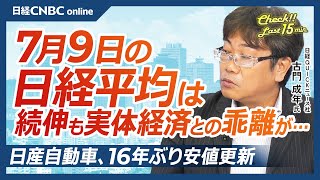 【7月9日(水)東京株式市場】日経平均株価は続伸/内閣府発表の景気動向指数は悪化し景気後退局面入りか/円安で自動車関連は上昇/日産自動車のみ16年ぶりの安値更新/吉野家決算は増収増益/足元の業績を注視