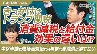 【消費減税と給付金、効果の違いと財源を解説│永濱利廣氏】トランプ関税機に物価高対策に批判/財政改善はインフレ…家計は苦しい、円安も要因/野党・立民や維新は食料品の非課税化案/与党・自民石破首相の判断は