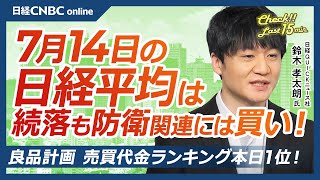 良品計画売買代金ランキング1位【7月14日(月)東京株式市場】日経平均株価は続落/日本株、台湾有事関与発言で防衛関連に買い/TSIホールディングスは経営統合報道で一時売買停止/円安で輸出関連銘柄好調
