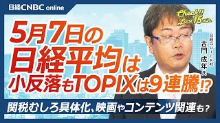トランプ関税、コンテンツ関連にも?│NQN古門成年氏【5月7日(水)東京株式市場】日経平均株価は小反落、米国株高や円安沈静化/TOPIXは9連騰/日本株・内需株に買い/バフェット発言で商社株は全面高