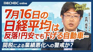 【7月16日(水)東京株式市場】日経平均株価は反落/蘭ASML決算受け半導体、利益確定売り/円安もトランプ関税による業績悪化警戒で自動車株売られる/リーマンショック以来の債券利回り上昇も銀行株下落