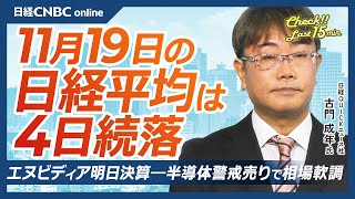 明日NVIDIA決算で分岐点か【11月19日(水)東京株式市場】日経平均は4日続落/キオクシアはAI関連期待と過剰投資で乱高下/日中対立で"水産物輸入停止"食品株売り目立つ/円安・金利上昇でトリプル安