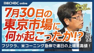 【7月30日(水)東京株式市場】日経平均株価は続落/日米金融政策控え様子見/好決算のアドテストは下落/フジクラは上場来高値更新中/シマノ4月に続き下方修正受け一時ストップ安/本日日産自動車決算|日本株