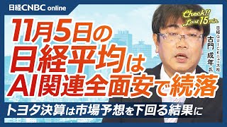 【11月5日(水)の東京市場を振り返り】SBGとアドテストで日経平均900円押し下げ/日米AI過熱感警戒/トヨタ市場予想下回る/サンリオは通期業績予想上方修正の好決算/本日ADP米雇用統計発表|日本株