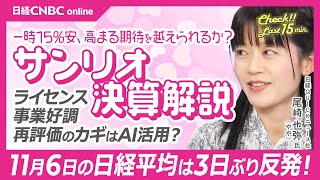 尾崎記者によるサンリオ決算解説!【11月6日(木)東京株式市場】日経平均株価は反発/米ハイテク株持ち直し/フジクラは明日決算発表で対米投資関連の話題があるか注目/日本郵船はコンテナ船運賃下落で下方修正