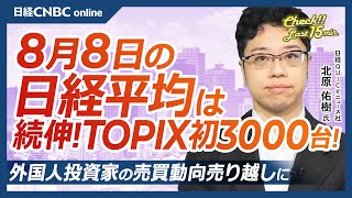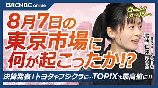 【8月7日(木)東京株式市場】日経平均株価は3日続伸、TOPIXは最高値に/トヨタ決算は今期利益の下方修正/フジクラが一転増益/光ファイバー好調/エムスリー決算好調で一時ストップ高