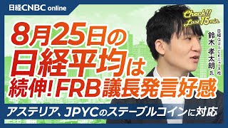 【8月25日(月)東京株式市場】日経平均株価は続伸/日本市場は円高と米10年債利回り低下が重荷/28日早朝にエヌビディア決算/アステリア、ステーブルコインに対応するアダプター開発で連日ストップ高