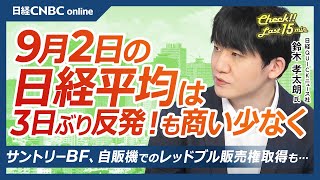 【9月2日(火)東京株式市場】日経平均株価は反発/サントリーBF、自販機でのレッドブル販売権取得も、新浪氏辞任/カバーは一時5%安も兎田ぺこら氏は卒業否定/伊藤園の決算は純利益29%増