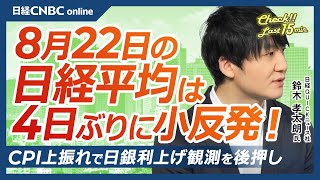 【8月22日(金)東京株式市場】日経平均株価は大引けで小反発/需給動向、海外投資家が現物・先物買い越し/7月CPI上振れで日銀利上げ観測を後押し/10年債も17年ぶり水準/来週27日エヌビディア決算