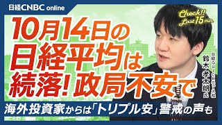 【10月14日(火)東京株式市場】日経平均株価は大幅続落/政治の不透明感広がる/海外投資家からはトリプル安警戒の声も/高市トレードならぬ玉木トレード?/良品計画、決算発表で逆行高/SBGは6%近く下落