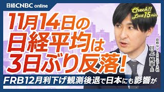 【11月14日(金)東京株式市場】日経平均は3日ぶりの反落/ハイテク株安重しとなり軒並み下落/FRB12月利下げ後退し日本市場にも波及か/キオクシアは期待届かず失望売り/三越伊勢丹好決算で堅調に推移
